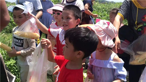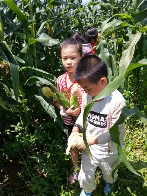 經(jīng)過一個(gè)小山坡,眼前出現(xiàn)一大片玉米地,頭戴紅纓強(qiáng),身穿綠羅袍,大熊老師一聲令下,小朋友們已經(jīng)蜂擁而上。媽媽們?cè)谝慌院爸佑图佑停?jīng)過一場5分鐘的角逐,有三位勇敢的小朋友分別獲得前三名,并獲得獎(jiǎng)品。