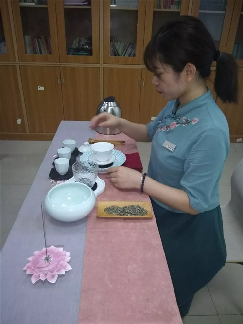稍事休息,就進入到真實體驗環(huán)節(jié)——綠茶品茗互動。在甄老師講課的間隙,助理茶藝師已做好品茶的所有準備工作。