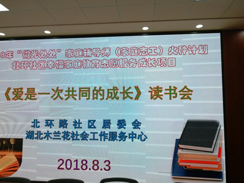 《愛(ài)是一次共同成長(zhǎng)》讀書(shū)交流會(huì)是北環(huán)路社區(qū)“微光處處”幸福家庭教育志愿服務(wù)成長(zhǎng)項(xiàng)目的服務(wù)內(nèi)容之一,項(xiàng)目的承接單位-----湖北木蘭花社會(huì)工作服務(wù)中心的項(xiàng)目負(fù)責(zé)人王小曼,小結(jié)了本次讀書(shū)交流活動(dòng)的成果,將高先生的家庭列為“微光處處”項(xiàng)目家庭輔導(dǎo)對(duì)象,并計(jì)劃利用家庭公約套盒來(lái)進(jìn)行不定期的家庭輔導(dǎo)。最后,還就后期的項(xiàng)目活動(dòng)計(jì)劃與兩位老師和在座的居民們進(jìn)行了交流。