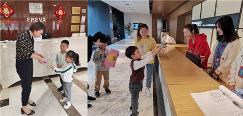 下午,小朋友們在老師的帶領(lǐng)下,走出幼兒園,給集團(tuán)的叔叔阿姨們送上親手制作的暖心卡片,在老師的陪伴下,勇敢地邁出第一步。