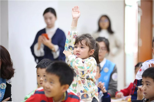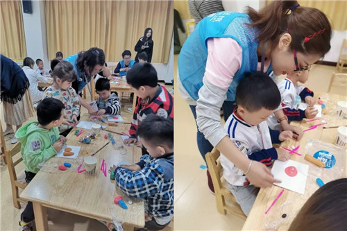 課堂上,小朋友們分成幾個(gè)組,每組由一個(gè)志愿者老師帶領(lǐng)。