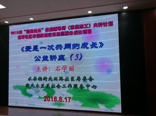 8月17日上午,水果湖街道北環(huán)路社區(qū)的居民們圍坐在一起,認(rèn)真聆聽由北大書同中級(jí)講師、家庭輔導(dǎo)師石學(xué)麗老師帶來(lái)的家庭幸福公益講座,這是北環(huán)路社區(qū)“微光處處”家庭志工火種計(jì)劃項(xiàng)目的服務(wù)內(nèi)容之一。