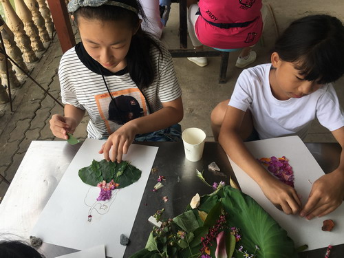 用完午餐之后,孩子們不愿意休息,滑梯、秋千、乒乓球、木馬等等,都想去玩一玩。2點(diǎn)鐘小朋友們?cè)趫?chǎng)地集合,以大地為教室,以自然為教具,以孩子的探索、發(fā)現(xiàn)為教材,一起用植物作畫(huà)獻(xiàn)給大自然。孩子們用豐富的想象力完成一張張作品,有用花朵做成裙子的、有小青蛙、小鳥(niǎo)、簡(jiǎn)筆荷花、五彩繽紛的天地、還有結(jié)合上午學(xué)到的詩(shī)詞做的《望廬山瀑布》,讓孩子們充分體現(xiàn)了自己的動(dòng)手能力。孩子們的每一張作品都得到了獎(jiǎng)勵(lì),孩子們的作品都值得保存。