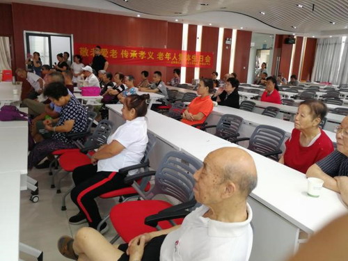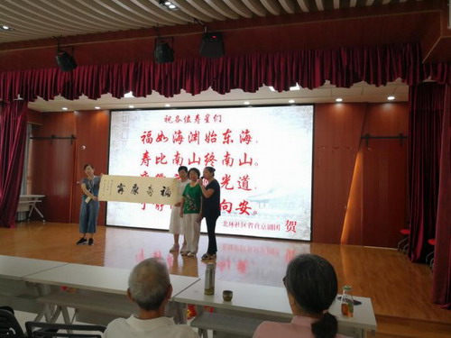 社區(qū)省直京劇團的董老為老壽星們帶來了京劇《工人們把碼頭面貌改》,字正腔圓,精神矍鑠,其人老心不老的精神狀態(tài),為在場的老壽星們作出了老有所為、老有所樂的表率。董老還為老壽星們帶來了一首祝壽詩: