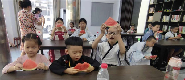 參加此次活動的青少年提前穿搭好精致的漢服,為此次活動帶來古風氛圍。在老師生動有趣的講述下,大家學習了《立秋》繪本內容,知道“啃秋瓜”“貼秋膘”和“摸秋”這些有趣的習俗?;顒蝇F(xiàn)場,社區(qū)工作人員還為青少年提供了美味的西瓜,一起體驗“啃秋瓜”,來消暑解熱和祈求美好祝福。