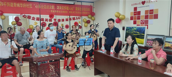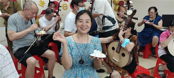 活動開始,社區(qū)器樂興趣班的10余位學員獻上了精彩的樂團演奏,其中最有特點的是用傳統(tǒng)樂器演奏現(xiàn)代歌曲《生日快樂》。在愉快的音樂聲中,和平街道辦事處副主任劉剛、青城華府社區(qū)書記余敏和企業(yè)退休人員代表一起,點燃生日蠟燭為企業(yè)退休人員慶生,并一一分發(fā)蛋糕。