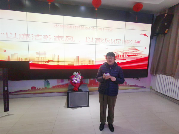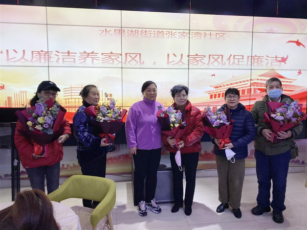 張家灣社區(qū)黨委書(shū)記高桂萍為廉潔家庭代表們獻(xiàn)花。她說(shuō),家風(fēng)是中華民族的優(yōu)秀傳統(tǒng)文化,良好家風(fēng)是新時(shí)代干事創(chuàng)業(yè)的助推器,社區(qū)舉行這場(chǎng)活動(dòng),起到了傳播好家風(fēng),推動(dòng)廉潔文化深入人心的效果。