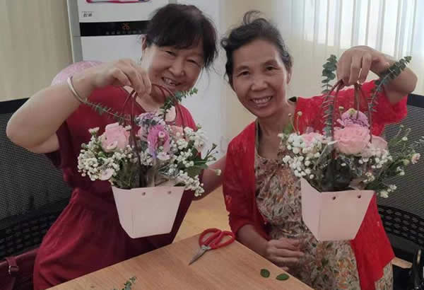 大家拿著剪刀把鮮花斜著剪出合適的高度,然后根據(jù)自己的喜好,在花籃的花泥中依次插入主花、配花。所有人都很認(rèn)真,沉浸在花香中。一朵朵鮮花在居民手中綻放,粉色的玫瑰、熱情的波斯菊、溫馨的康乃馨、紫色的桔?;?、浪漫的滿天星、翠綠的尤加利,鮮花最終匯聚成一件件精美的作品?;ㄋ嘍IY完成后,大家紛紛拍照留念。居民朱奶奶說:“感謝社區(qū),感謝木蘭花社服機(jī)構(gòu),讓大家參加有意義的插花活動(dòng),豐富了大家的業(yè)余生活?!?/p>