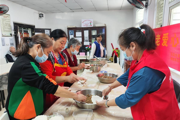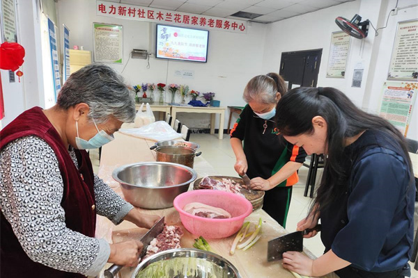 在電力新村社區(qū)木蘭花老年人服務(wù)中心,一場(chǎng)“重陽節(jié)手工制作燒賣活動(dòng)”正在進(jìn)行。燒賣造型獨(dú)特,像一朵小花,薄而韌的外皮包裹著糯米肉餡,又香又糯?!鞍衙婧秃?、餡拌好,將面皮搓圓后攤平,然后把餡兒放在中間,以食指和拇指的力量慢慢向上收口,合攏后放入籠屜蒸熟……”江老師向居民們講解著做燒賣的流程,大家按照這個(gè)方法邊學(xué)邊做,不一會(huì)兒,一個(gè)個(gè)精美的燒賣便成型了。