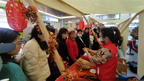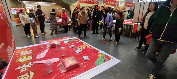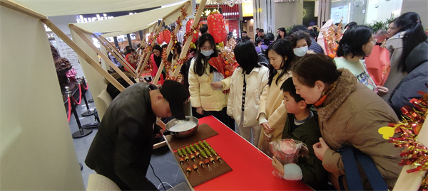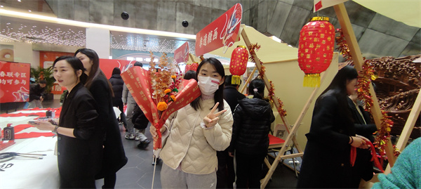 現(xiàn)場(chǎng)職工青年在糖畫前面排起了長(zhǎng)隊(duì),等著觀看非遺老師用晶瑩剔透的糖勾勒出的“龍”的形態(tài),幸運(yùn)的是還可以領(lǐng)取一份糖畫品嘗。有的青年職工在糖葫蘆前面排隊(duì),領(lǐng)取可愛(ài)的水果糖葫蘆,回憶童年的味道。最近很火的毛根做柿子,也在現(xiàn)場(chǎng)開(kāi)展起來(lái)。手工老師現(xiàn)場(chǎng)示范如何用橙色的毛根做個(gè)飽滿的柿子,并將柿子、冬青紅果、尤加利、銀杏葉等包扎成一束新年主題花束。熱愛(ài)生活的青年職工認(rèn)真積極的學(xué)習(xí)著,不一會(huì)一束花就包扎好了,紛紛舉起手機(jī)拍照留念。套圈游戲也深受大家的喜愛(ài),有的為套到的職工歡呼,有的為差一點(diǎn)套到的職工惋惜,熱鬧非凡?;顒?dòng)現(xiàn)場(chǎng)的王女士拿著自己套的龍年抱枕開(kāi)心的說(shuō):“感謝水果湖街道黨建辦和長(zhǎng)城匯物業(yè)開(kāi)展這么有趣的活動(dòng),讓我們?cè)谛履陙?lái)臨之際感受到了溫暖的關(guān)懷!”