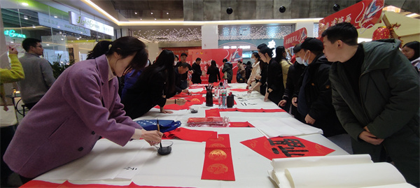 活動(dòng)現(xiàn)場(chǎng)早早的布置起來(lái),新年的氛圍在紅紅的燈籠點(diǎn)綴下越加喜慶。隨著青年職工休息的時(shí)間到了,看到這邊的迎新年活動(dòng),紛紛陸續(xù)參與其中。俗話說(shuō):無(wú)聯(lián)不成春,有聯(lián)春更濃。活動(dòng)現(xiàn)場(chǎng)邀請(qǐng)了多名書法家揮毫潑墨為大家書寫精美的春聯(lián)和福字。老師們神情專注地舞動(dòng)手中的毛筆,為大家書寫出一幅幅寓意吉祥、充滿喜慶的春聯(lián)和福字。老師們的精湛書法,引得現(xiàn)場(chǎng)青年職工陣陣夸贊。