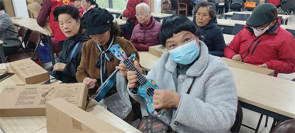 活動上老師向大家介紹了時下非常流行的樂器尤克里里,是一種小型四弦樂器,起源于夏威夷。它的音色和簡潔的演奏方式使人們能夠享受音樂的快樂并表達自己的情感。居民們手拿尤克里里,新奇又喜歡,紛紛嘗試彈奏。然后又組織居民學(xué)習(xí)制作大漆扇子,將我國傳統(tǒng)漆藝與團扇藝術(shù)相結(jié)合。大漆團扇根據(jù)漆不溶于水的特質(zhì),以價格昂貴的天然漆為主、然后加入天然礦物質(zhì)顏料進行研磨、最后與天然植物油進行調(diào)和,將調(diào)制好的色漆滴入水面、在水面瞬間形成流動的花紋。老師價紹說,制作中運用了非遺漆藝中的“漂漆”技法,并加入稀釋油調(diào)漆色,再指導(dǎo)居民將空白紙扇子上下、左右、旋轉(zhuǎn)的方式插入容器內(nèi),輔以點、甩、彈、劃等手法,然后印上不同比例的顏色,最后一把獨一無二的漆扇作品就誕生了。居民看到自己制作的大漆團扇愛不釋手。