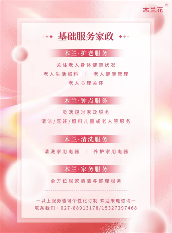 除了個性化高端定制服務(wù),木蘭花家政還為武漢市民提供7大類26項普惠基礎(chǔ)家政服務(wù)。