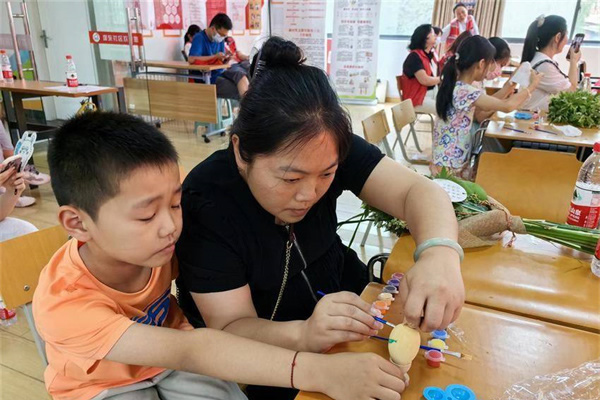 繪畫老師給小朋友們發(fā)放了彩蛋。孩子們拿到圓滾滾的彩蛋后,在老師的指導(dǎo)下在彩蛋上繪畫。他們迫不及待地施展自己的畫技,發(fā)揮天馬行空的想象力,有的畫粽子、有的畫臉譜、有的畫卡通人物、有的畫動物,用五彩的畫筆賦予彩蛋美麗的顏色和外衣。畫好后,孩子們高興地向家長展示自己的作品,大家共同舉起艾草花束及彩蛋繪畫作品合影留念,每組家庭的臉上都洋溢著開心的笑容。