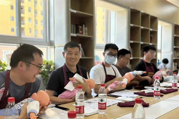 活動(dòng)現(xiàn)場(chǎng)展開了“育嬰”實(shí)操比武,參與者們圍上圍裙,利用仿真寶寶及其他道具,從新生兒穿衣、洗澡、撫觸以及喂奶、配奶等技能進(jìn)行激烈比拼,現(xiàn)場(chǎng)氛圍熱烈,大家熱情高漲,紛紛展示自己新學(xué)的技能?;顒?dòng)特別設(shè)置了“超級(jí)奶爸大比拼”環(huán)節(jié),新手奶爸們躍躍欲試,“十八般武藝”齊上陣,精準(zhǔn)完成各項(xiàng)育嬰動(dòng)作。