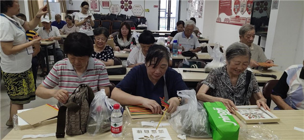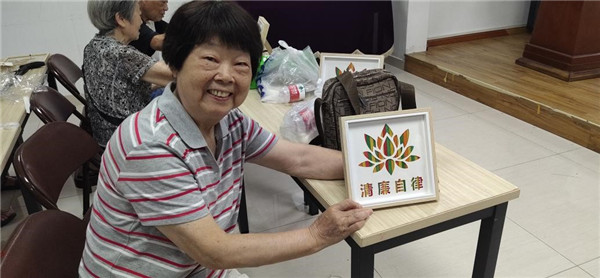 接下來,社工教現(xiàn)場黨員和居民制作清廉主題竹編畫。黨員和居民們跟著社工一起制作,先將膠粘在背板上,然后將彩色竹篾一次排開,在進行編制,不一會,一副精美的竹編畫就完成了。通過制作精美的清廉主題竹編畫,可以讓清廉理念更加深入人心。