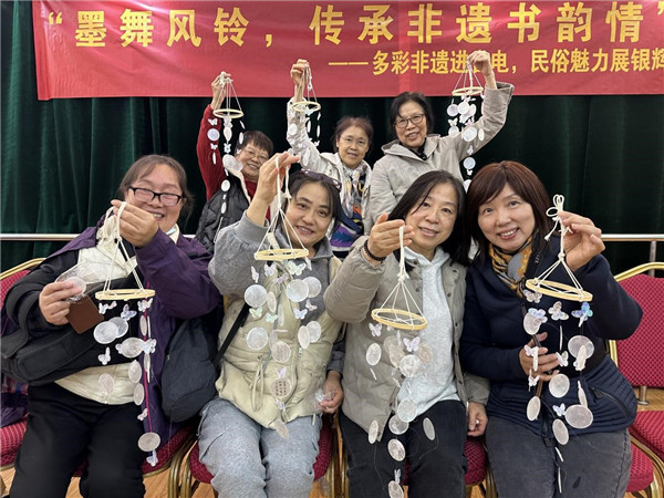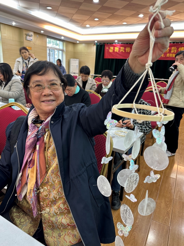 “叮鈴鈴,風(fēng)鈴的聲音真好聽(tīng)!在制作這個(gè)風(fēng)鈴的過(guò)程中,我仿佛與古人進(jìn)行了一場(chǎng)跨越時(shí)空的對(duì)話(huà),感受到了書(shū)法的力量與風(fēng)鈴的靈動(dòng)。這不僅是一個(gè)作品,更是我們共同記憶的一部分。感謝社區(qū)為我們搭建了這樣一個(gè)平臺(tái),讓我們能夠一起學(xué)習(xí)、一起創(chuàng)造,共同守護(hù)這份寶貴的文化遺產(chǎn)。希望未來(lái),我們社區(qū)能繼續(xù)舉辦更多這樣的活動(dòng),讓傳統(tǒng)文化在我們每一個(gè)人的心中生根發(fā)芽,綻放出更加璀璨的光彩?!爆F(xiàn)場(chǎng)的張阿姨一邊拉著伙伴拍照,一邊開(kāi)心的展示手里的書(shū)法貝殼風(fēng)鈴。