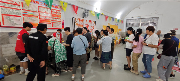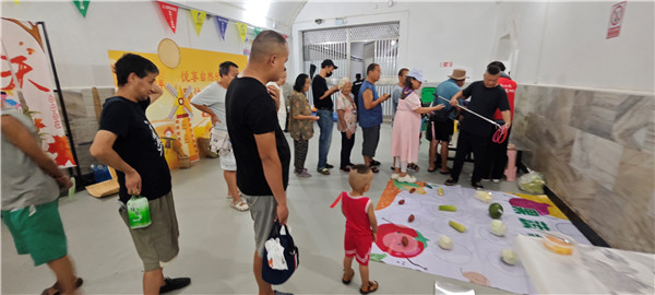 社工早早的來到蛇山人防納涼點進行布場,金黃的南瓜搭配著沉甸甸的麥穗,竹筐和簸箕搭建出小谷倉。活動開始后,人頭攢動。“推車運糧” 處,頭發(fā)花白的老爺爺緊握車把,沉穩(wěn)推車,笑容慈祥;“蔬果連連看” 攤位,幾位大媽圍著展板,時而討論時而蹙眉,戴眼鏡的大媽反應敏捷,很快找出多對相同蔬果,面露得意;果撈仙草凍臺前香氣四溢,幾位老奶奶圍坐品嘗,不時贊嘆;“DIY 蒲扇” 區(qū),居民們認真涂鴉,或畫花草或?qū)?“立秋”;果蔬套圈場地熱鬧,中年大叔瞄準西瓜,扔出的套圈穩(wěn)穩(wěn)落下,引來歡呼。各色身影穿梭,笑語不斷,滿是歡樂氛圍。