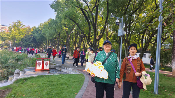游戲結(jié)束后,老人們開啟自由休憩時光:喜歡安靜的在湖邊長廊品茶聊天,欣賞湖景;熱衷活動的則前往健身區(qū)體驗便民器材;還有人結(jié)伴在桂花林散步,享受秋日的寧靜。上午11時,在工作人員的提醒下,40 位老人戴著定制棒球帽,拎著剩余的能量包,有序集合乘坐大巴返程,活動圓滿落幕。