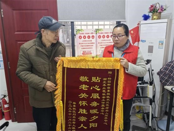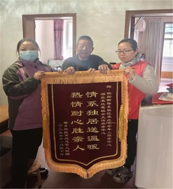“這面錦旗,是我們?nèi)业男囊猓 秉S興忠老人送來(lái)的錦旗上,“情系獨(dú)居送溫暖,熱情耐心勝親人”十四個(gè)字格外醒目。他今年84歲,子女遠(yuǎn)住的比較遠(yuǎn),家里的水管漏水、電燈損壞,都是社區(qū)老年人服務(wù)中心的工作人員上門幫忙修理;天氣變化時(shí),還會(huì)特意打電話提醒他添衣保暖?!吧洗挝腋忻鞍l(fā)燒,工作人員不僅幫我買了藥,還熬了粥送過(guò)來(lái),說(shuō)‘您趁熱喝,發(fā)發(fā)汗就好了’,這話聽得我心里比粥還暖?!?/p>