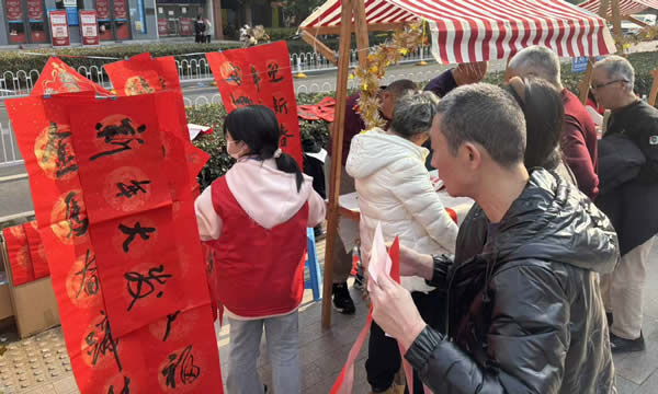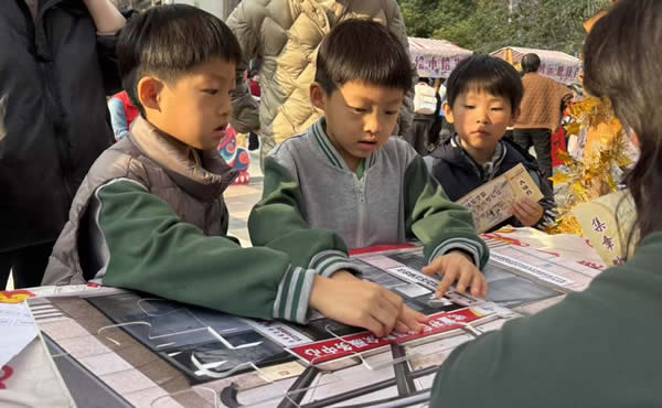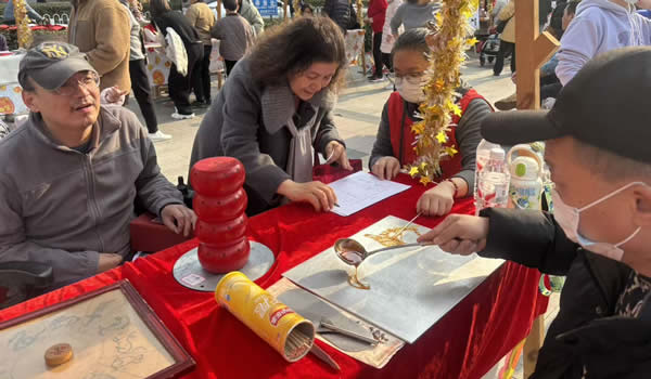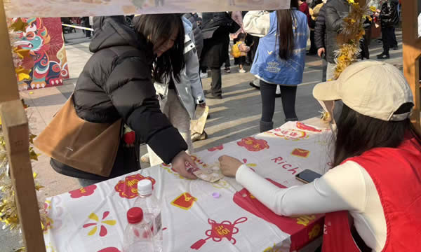 社區(qū)書法社志愿者現(xiàn)場揮毫潑墨,為居民書寫春聯(lián)、送上 “?!?字,筆墨飄香間傳遞新春祝福;非遺糖畫藝人手持工具勾勒龍鳳、生肖等吉祥圖案,晶瑩剔透的糖畫與酸甜可口的糖葫蘆,讓居民重拾童年記憶。剪窗花、制作燈籠攤位前更是熱鬧非凡,彩紙、剪刀、竹篾、絲帶等材料整齊擺放,居民們圍坐一堂,老人們耐心傳授折疊、裁剪、粘貼技巧,孩子們學(xué)得專注認(rèn)真,指尖翻飛間,一幅幅寓意吉祥的窗花(喜鵲登梅、年年有余)、一盞盞造型別致的燈籠逐漸成型,大家互相展示成品、分享技巧,歡聲笑語中滿是對新年的期盼,盡顯傳統(tǒng)民俗的獨(dú)特魅力。旋轉(zhuǎn)釣福馬、社區(qū)拼圖、新年趕年獸等游戲集章區(qū)攤位前人頭攢動(dòng),老少居民通力協(xié)作、踴躍參與,在趣味闖關(guān)過程中增進(jìn)鄰里交流;知識(shí)競猜環(huán)節(jié)圍繞社區(qū)建設(shè)、傳統(tǒng)文化、安全常識(shí)等內(nèi)容展開,既考驗(yàn)學(xué)識(shí)又增添樂趣,集章滿4項(xiàng)的居民收獲到各種精美小禮品。