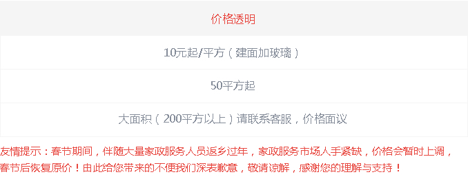 1.擦玻璃: 使用玻璃刮,抹水器,無(wú)泡玻璃水,強(qiáng)力清洗劑,徹底清除污垢(包括窗框清理,保護(hù)膜的清理,窗戶縫的吸塵,保潔公司提醒您對(duì)一些頑固的水泥點(diǎn)膠質(zhì)可用玻璃鏟刀去除),藥水中有防靜電成分,經(jīng)擦拭過(guò)的玻璃、窗框晶瑩光亮,不沾灰。